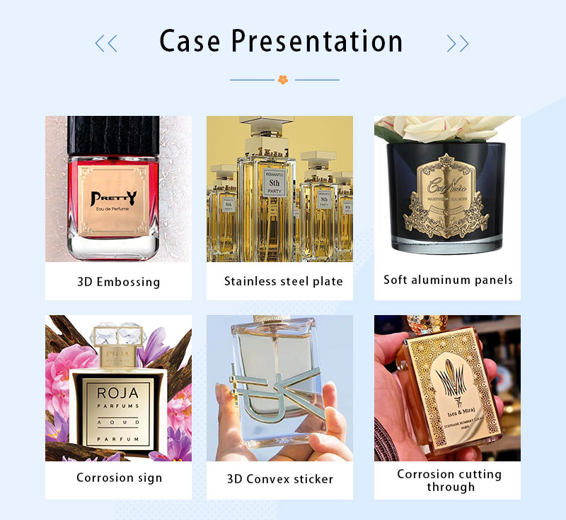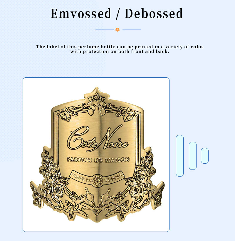 Custom two-tone metal perfume labels with exquisite patterns and a light luxury texture, enhancing the premium feel of the product